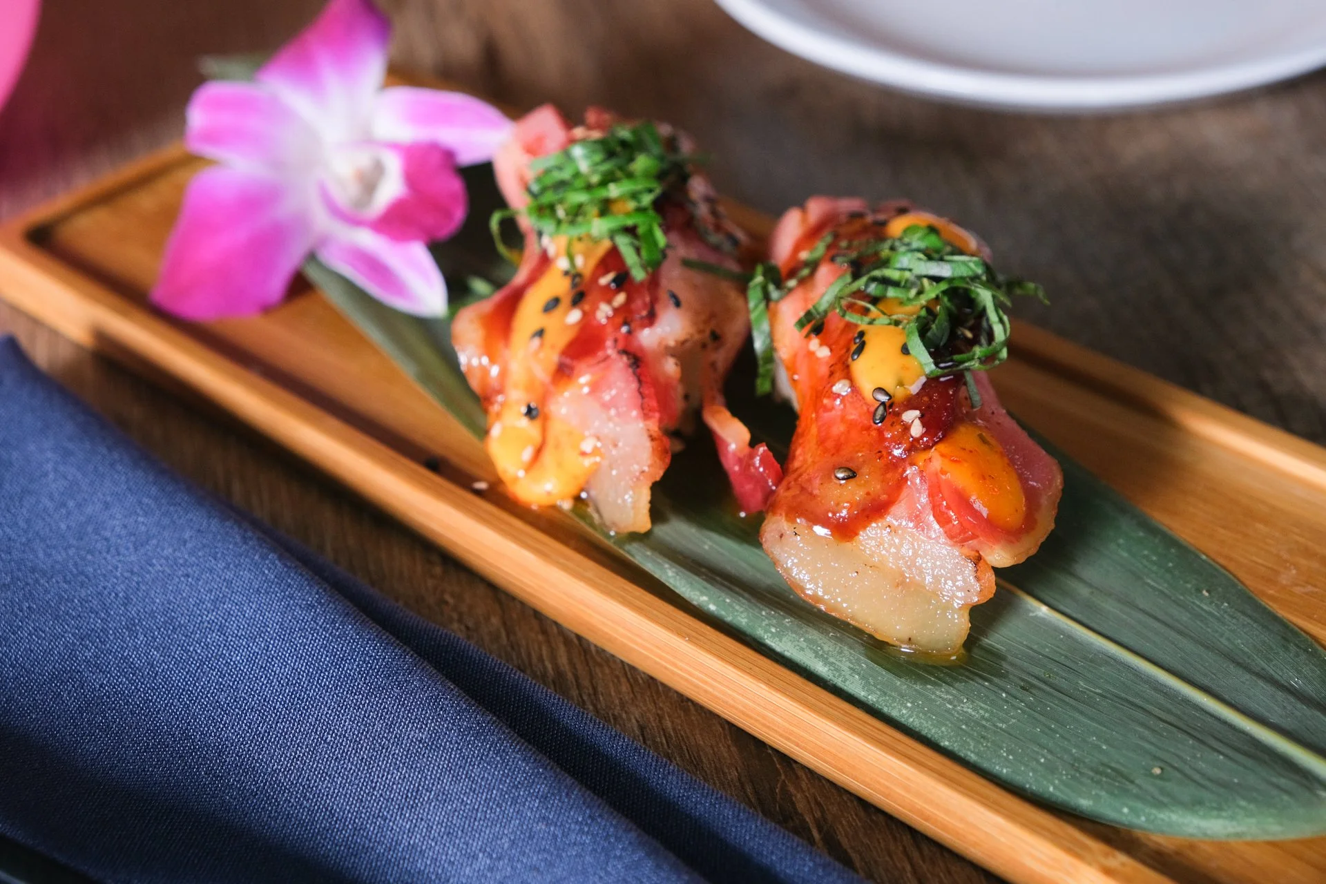 Yuzu mayo, black tobiko, scallions, pickled fresno, toasted sesame seeds.